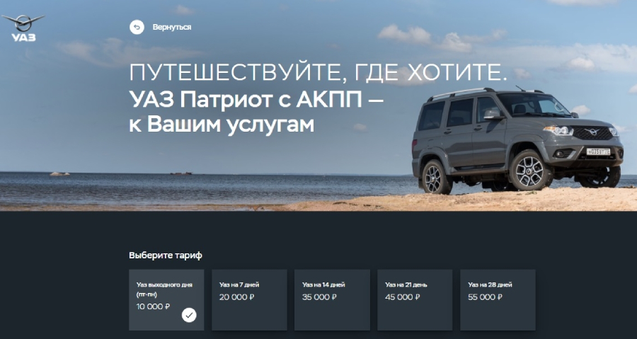 The new online service will allow you to rent an UAZ Patriot off-road vehicle with automatic transmission for up to 28 days.