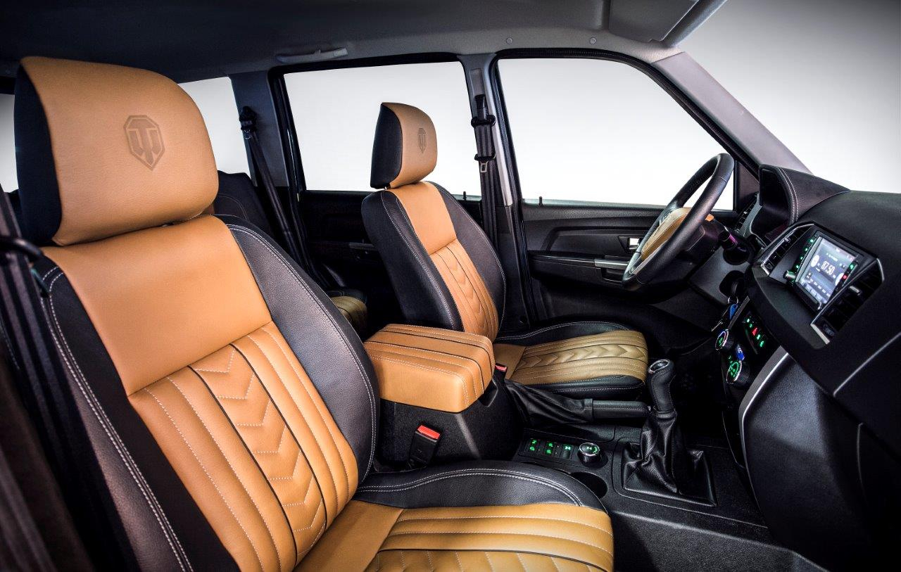 УАЗ ПАТРИОТ WORLD OF TANKS EDITION выпущен с премиальной кожаной отделкой передних и задних сидений со специальными вставками. Центральная часть сидений вместе с подголовниками выполнена из натуральной кожи эксклюзивного цвета «коньяк», а также дополнена фирменной символикой WORLD OF TANKS и стильной строчкой. Оригинальный интерьер автомобиля дополняет кожаная отделка козырька приборной панели, а также чехлов рукояток КПП, стояночного тормоза и переднего центрального подлокотника с кожаной отделкой цвета «коньяк» со строчкой. Кроме того, на двери багажного отделения автомобиля размещен шильд WORLD OF TANKS, обозначающий специальную комплектацию. Также при включении зажигания, на экране мультимедиа системы загорается логотип игры WORLD OF TANKS и фирменное приветствие.