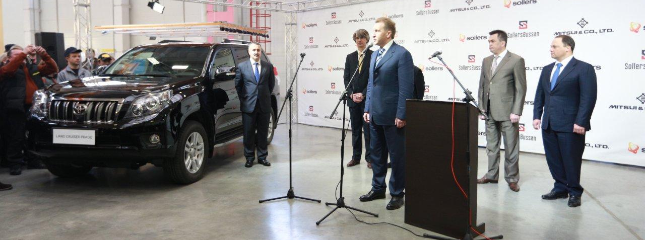 25 января 2012 г, г. Владивосток. Совместное предприятие ОАО «СОЛЛЕРС» и Mitsui & Co («СОЛЛЕРС-БУССАН») запустило тестовое производство Toyota Land Cruiser Prado. Новую производственную площадку посетил Первый заместитель Председателя Правительства Российской Федерации Игорь Шувалов. Серийное производство автомобилей Toyota Land Cruiser Prado будет запущено в феврале. СП «СОЛЛЕРС-БУССАН», доли сторон в котором распределены между СОЛЛЕРС и Mitsui & Co в соотношении 50/50, будет осуществлять производство автомобилей при технической поддержке компании Toyota. На первом этапе, предполагаемые объемы производства СП составят около 1000 а\м в месяц. Реализация проекта «СОЛЛЕРС-БУССАН» во Владивостоке станет дополнительным стимулом для развития региона и позволит повысить доступность автомобилей Toyota для российских покупателей, и в частности для жителей Дальнего Востока.